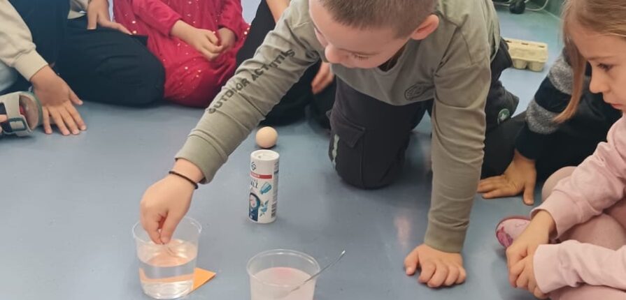 Die Kinder der Vorschulklasse durften heute mit Salz experimentieren. Sie waren ganz überrascht, dass ein Ei im Salzwasser schwimmt.