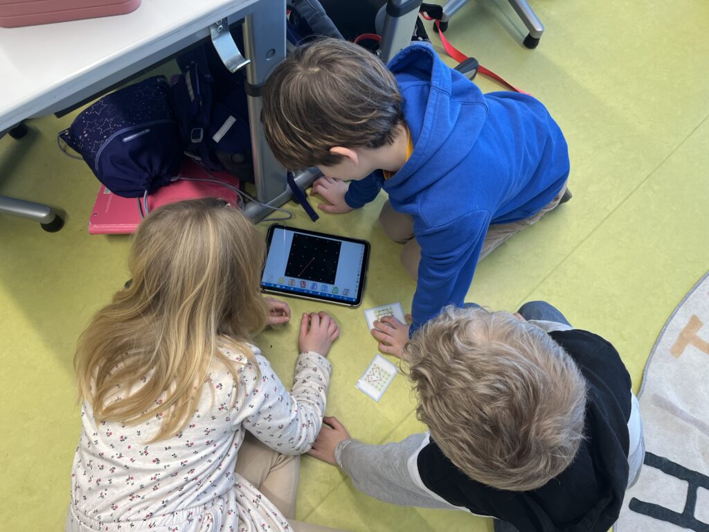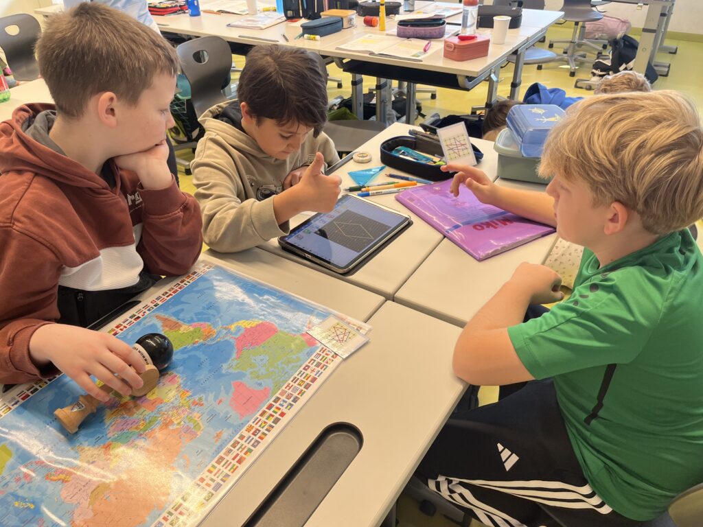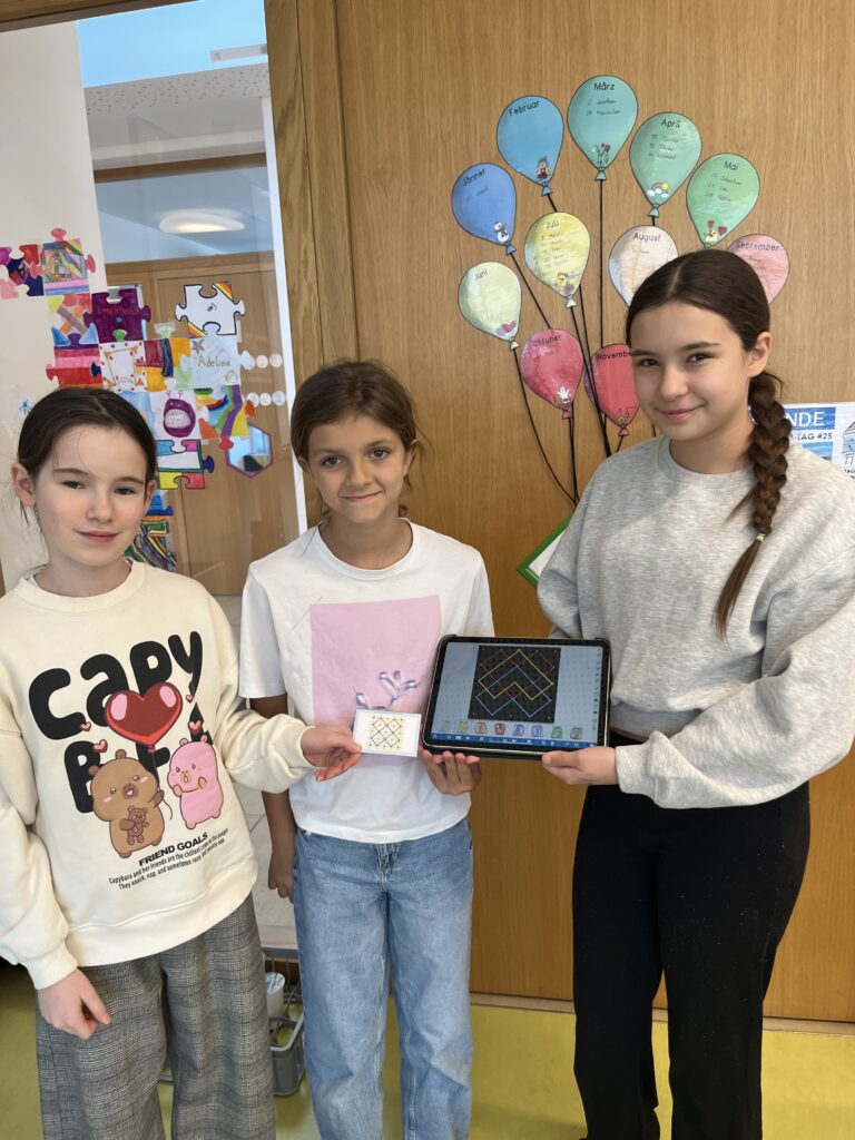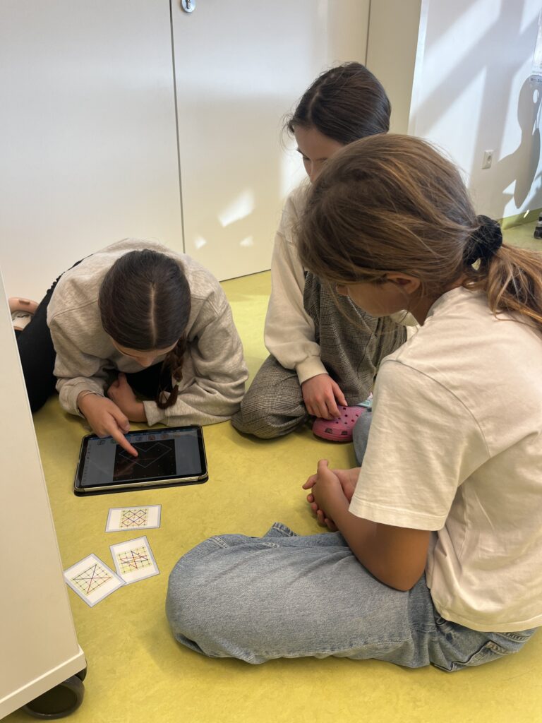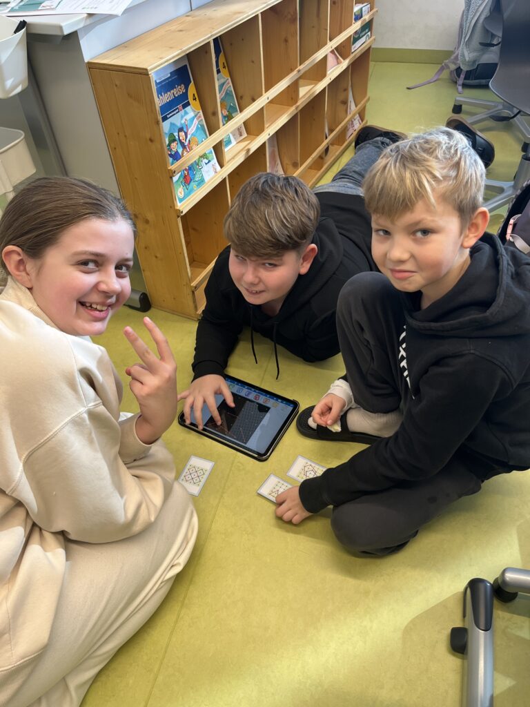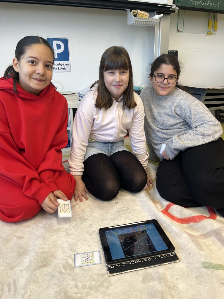 Heute haben wir im Mathematikunterricht erstmals mit unseren neuen Schul-iPads in Kleingruppen gearbeitet. Mit der App „Geoboard“ konnten wir verschiedene geometrische Formen spannen. Anhand von Aufgabenkärtchen bearbeiteten wir unterschiedliche Schwierigkeitsstufen und legten zudem symmetrische Figuren. Einige Schülerinnen und Schüler entwickelten anschließend selbstständig Spiegelungsaufgaben für ihre Gruppe. Zum Abschluss übertrugen wir das Gelernte aus der App in unser Mathematikbuch und hielten es dort schriftlich fest.