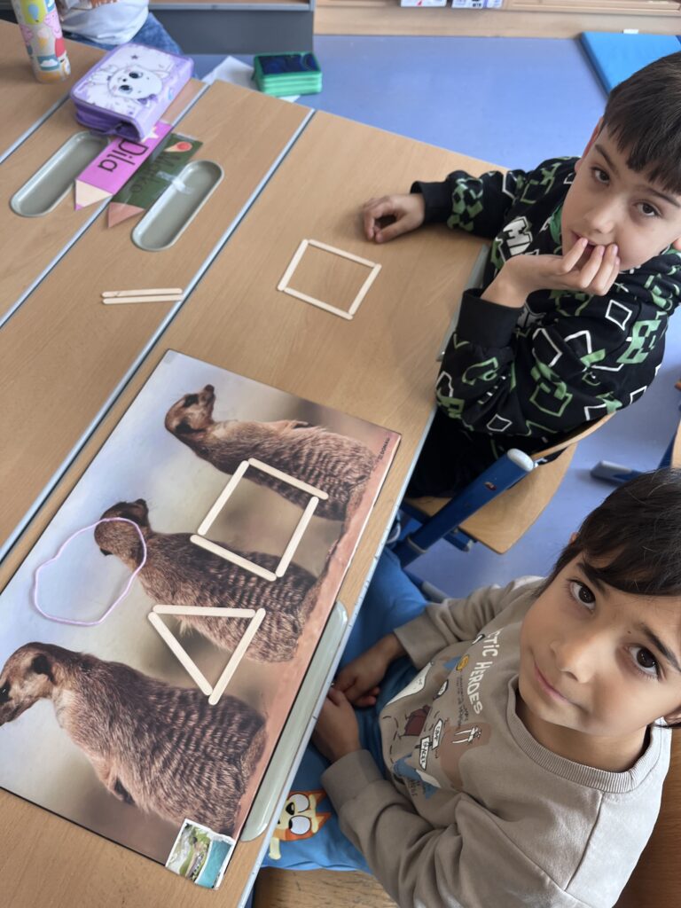 Nachdem wir die Formen entdeckt haben, durften die Kinder selbst aktiv werden und in Partnerarbeit versuchen, Kreis, Dreieck sowie Viereck mit unterschiedlichen Materialien zu legen.